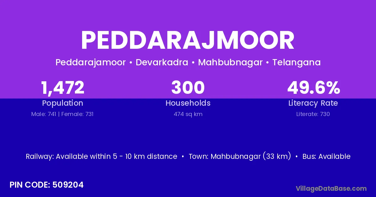 Mahbubnagar (33 km) is the nearest town to Peddarajmoor village for major economic activities and is located approximately 33 km away.