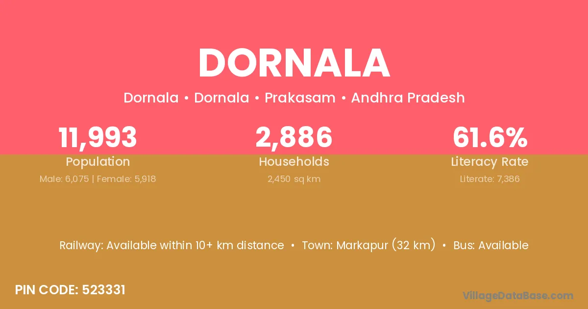 The literacy rate of Dornala village is 39.42%. Male literacy stands at 45.61% and female literacy at 33.22%.