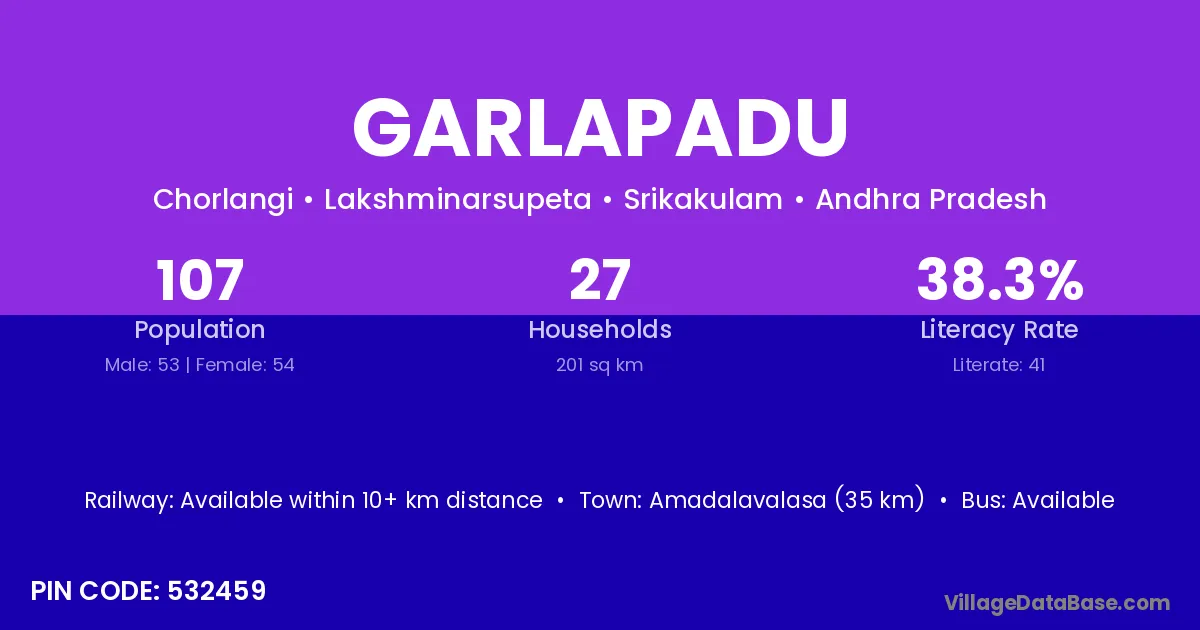 The literacy rate of Garlapadu village is 34.39%. Male literacy stands at 45.26% and female literacy at 23.18%.