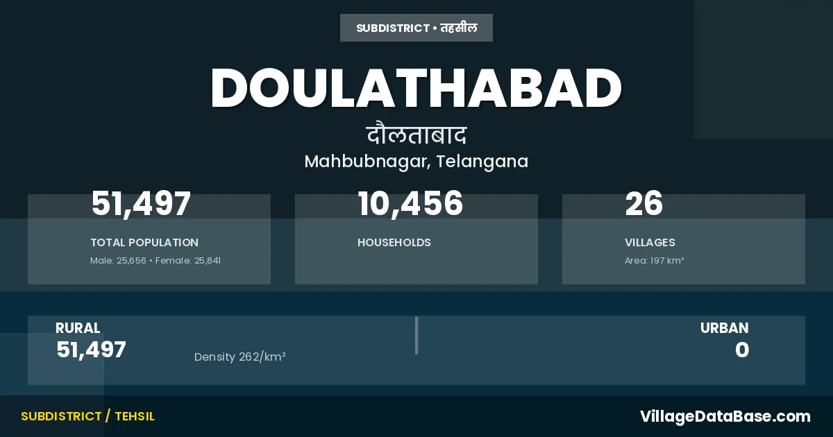 According to the 2011 census The total area of Doulathabad Mandal is 197 km², with a population of 51497 people. The population density is 262 inhabitants per square kilometre, and there are approximately 10456 houses in the sub district.