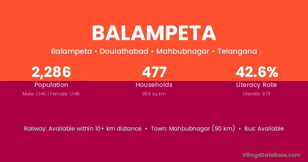 Mahbubnagar (90 km) is the nearest town to Balampeta village for major economic activities and is located approximately 90 km away.