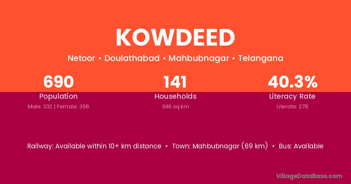 Mahbubnagar (69 km) is the nearest town to Kowdeed village for major economic activities and is located approximately 69 km away.