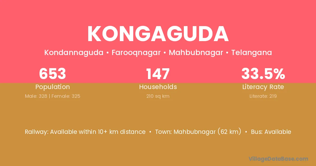 Mahbubnagar (62 km) is the nearest town to Kongaguda village for major economic activities and is located approximately 62 km away.
