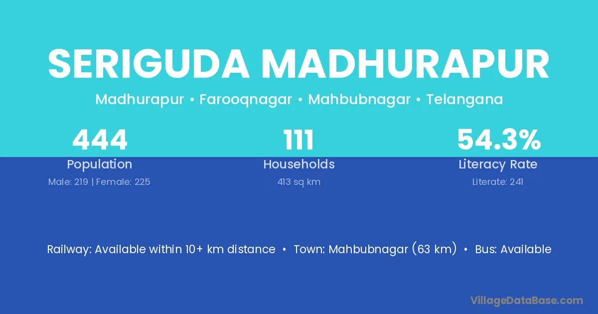 Mahbubnagar (63 km) is the nearest town to Seriguda Madhurapur village for major economic activities and is located approximately 63 km away.
