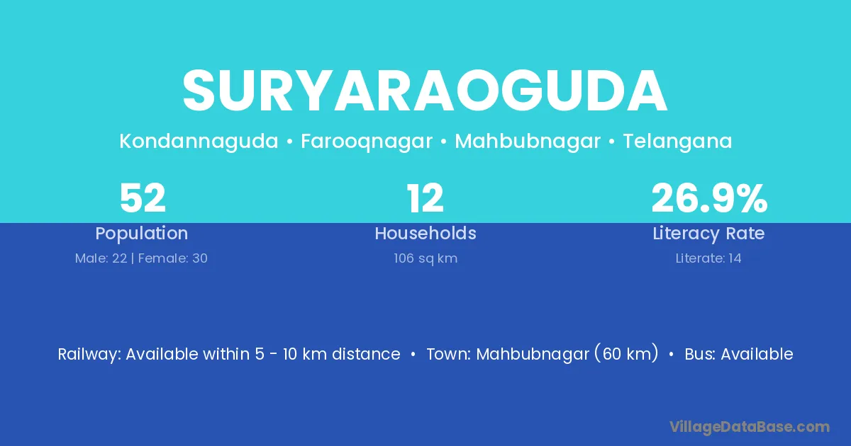 Mahbubnagar (60 km) is the nearest town to Suryaraoguda village for major economic activities and is located approximately 60 km away.