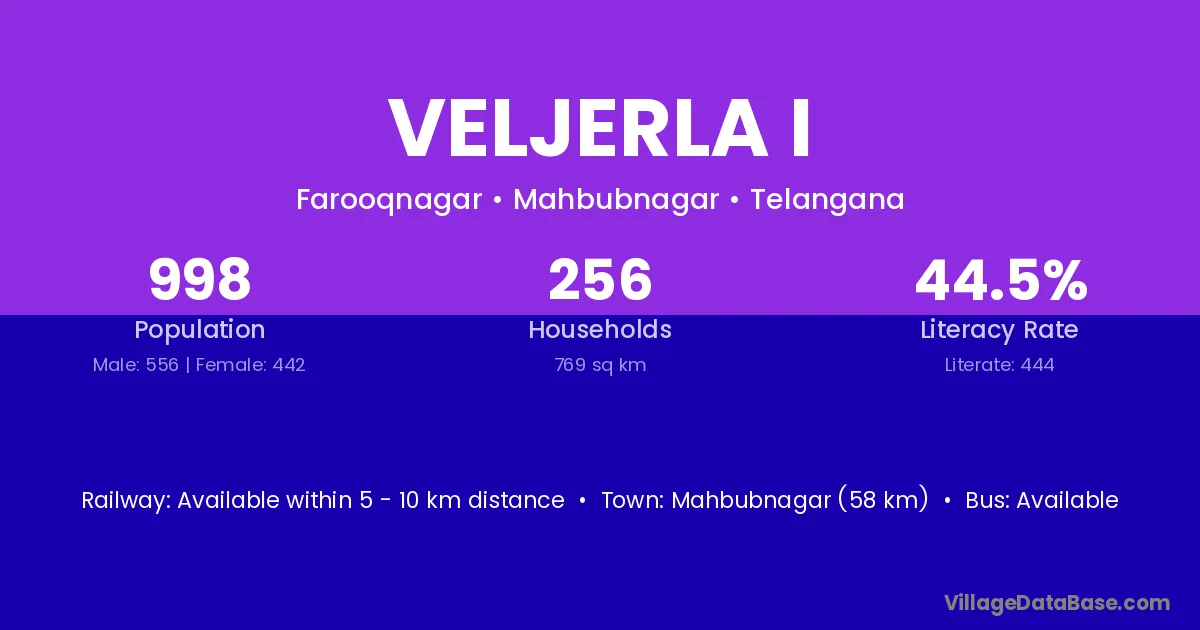 Mahbubnagar (58 km) is the nearest town to Veljerla I village for major economic activities and is located approximately 58 km away.
