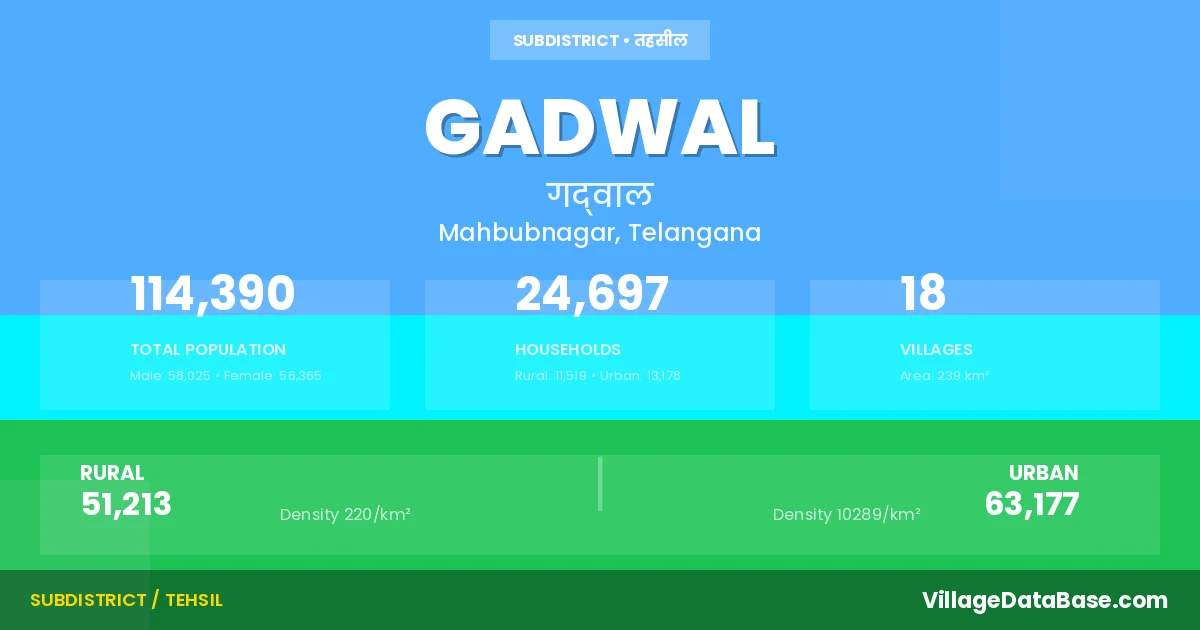 According to the 2011 census The total area of Gadwal Mandal is 239 km², with a population of 114390 people. The population density is 478 inhabitants per square kilometre, and there are approximately 24697 houses in the sub district.