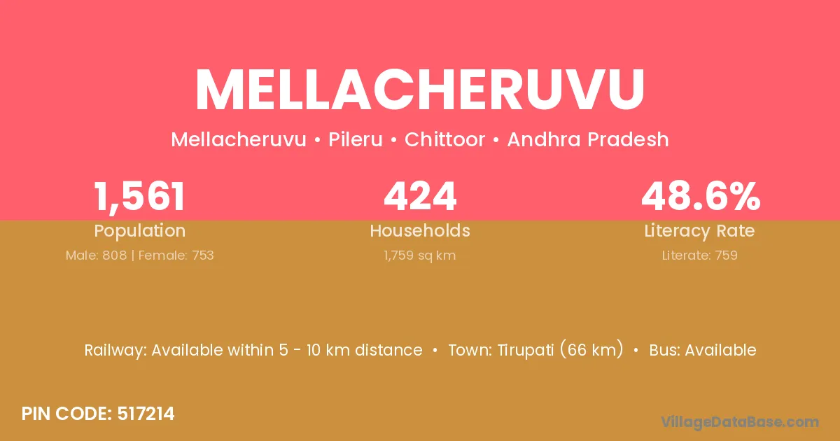 The literacy rate of Mellacheruvu village is 41.49%. Male literacy stands at 51.09% and female literacy at 30.48%.