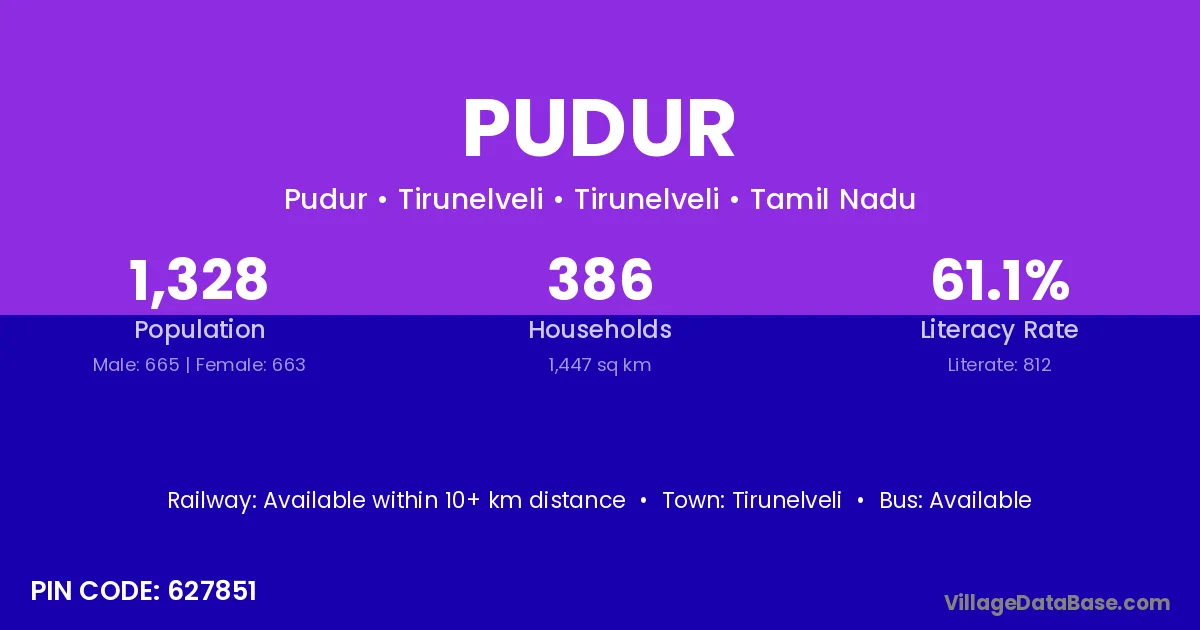 The literacy rate of Pudur village is 41.63%. Male literacy stands at 50.59% and female literacy at 32.13%.