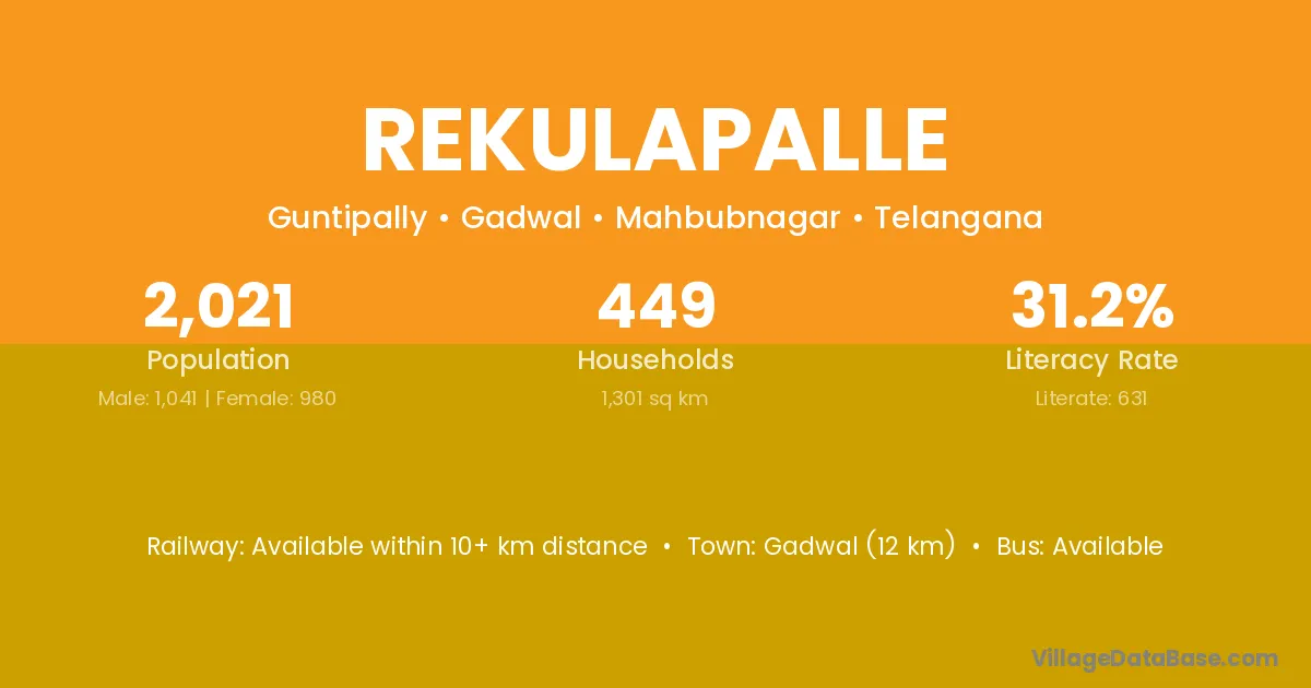 Gadwal (12 km) is the nearest town to Rekulapalle village for major economic activities and is located approximately 12 km away.