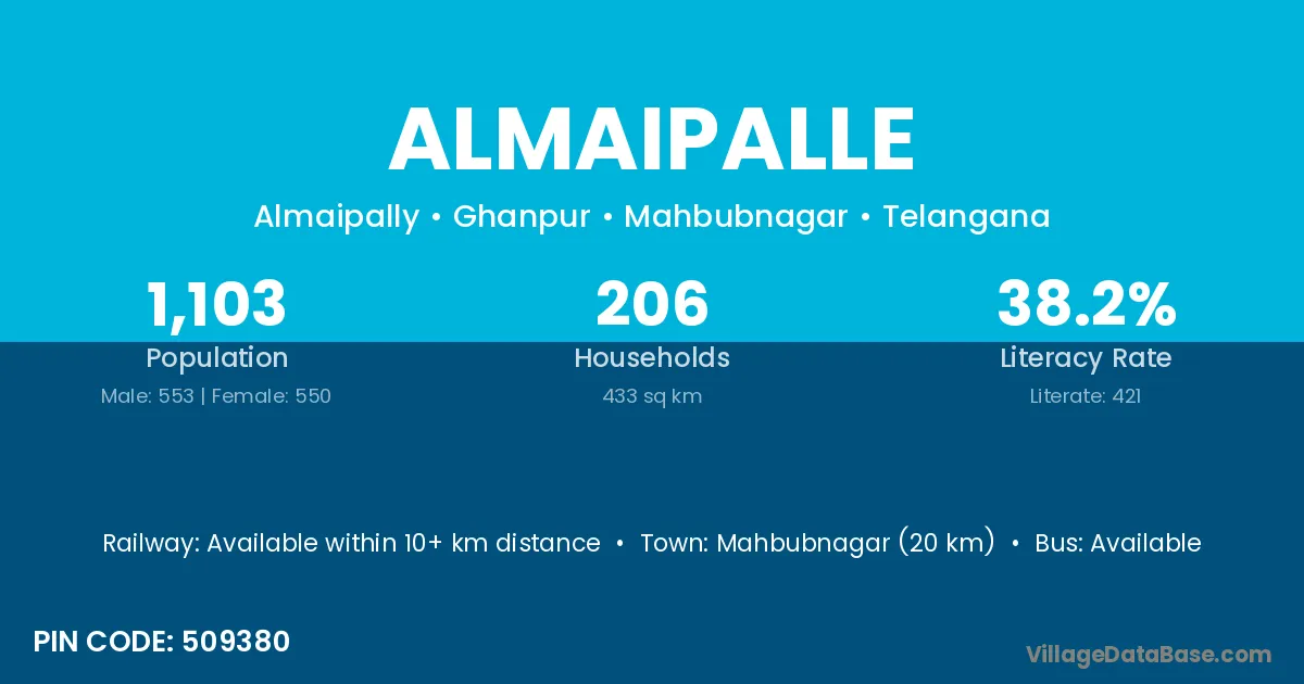 Mahbubnagar (20 km) is the nearest town to Almaipalle village for major economic activities and is located approximately 20 km away.
