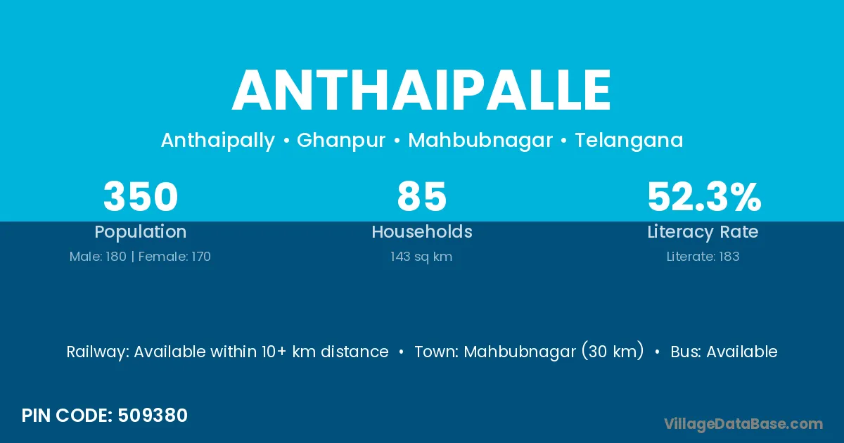 Mahbubnagar (30 km) is the nearest town to Anthaipalle village for major economic activities and is located approximately 30 km away.