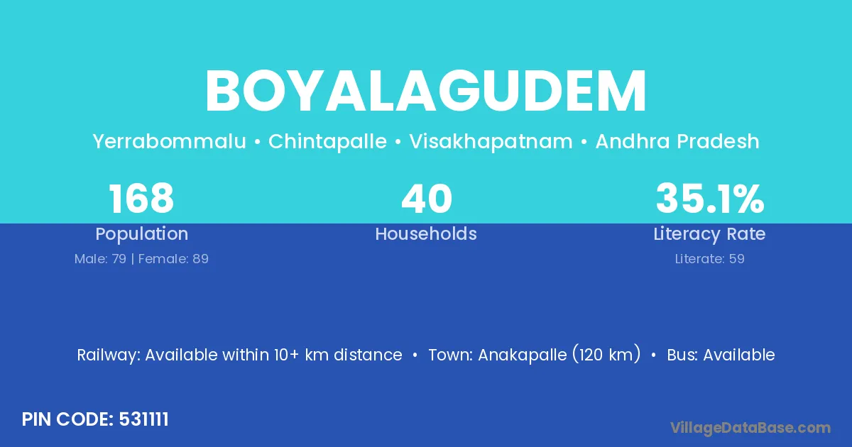 The literacy rate of Boyalagudem village is 27.94%. Male literacy stands at 36.52% and female literacy at 19.32%.