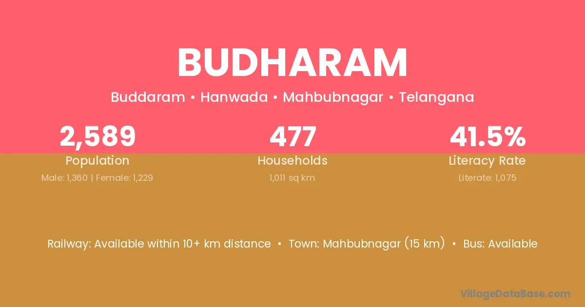 Mahbubnagar (15 km) is the nearest town to Budharam village for major economic activities and is located approximately 15 km away.