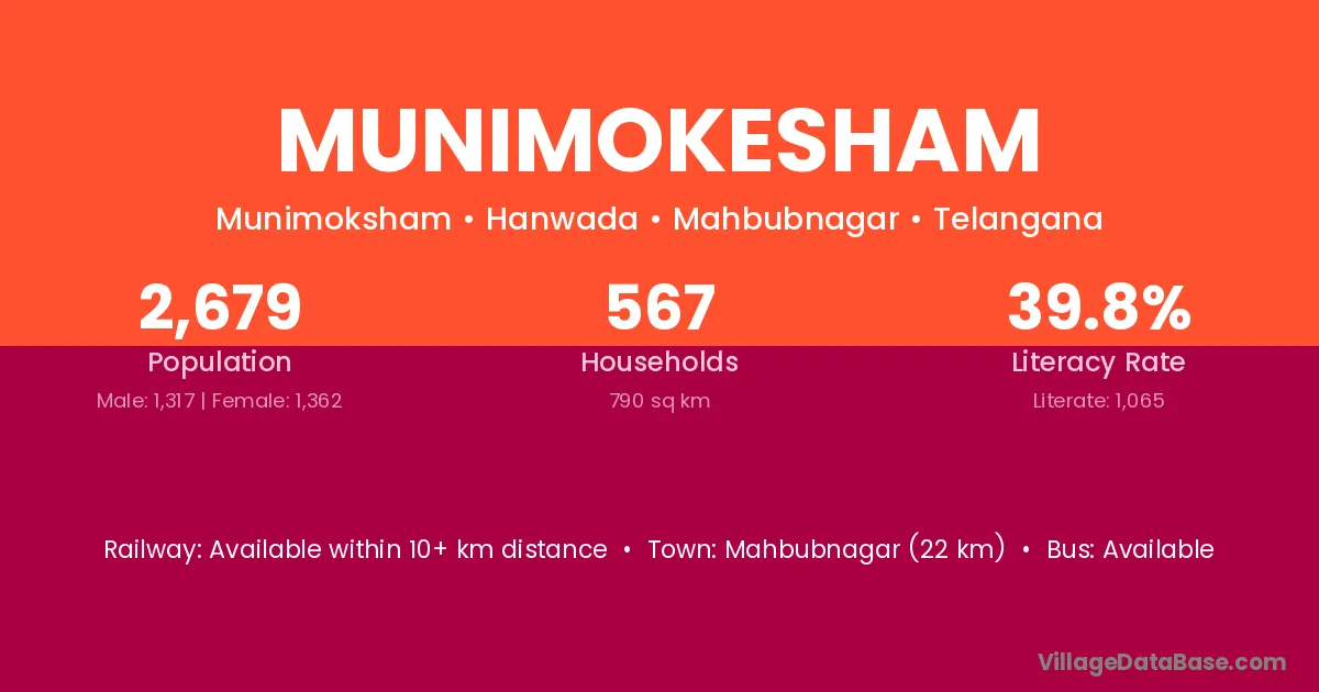 Mahbubnagar (22 km) is the nearest town to Munimokesham village for major economic activities and is located approximately 22 km away.