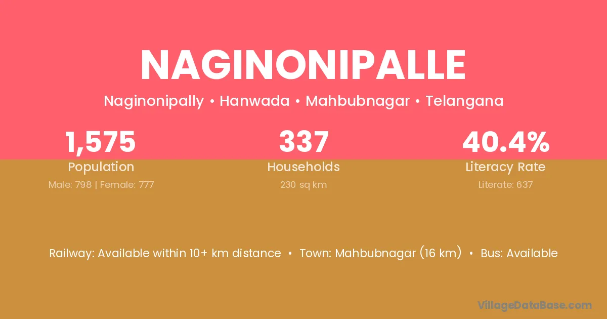 Mahbubnagar (16 km) is the nearest town to Naginonipalle village for major economic activities and is located approximately 16 km away.