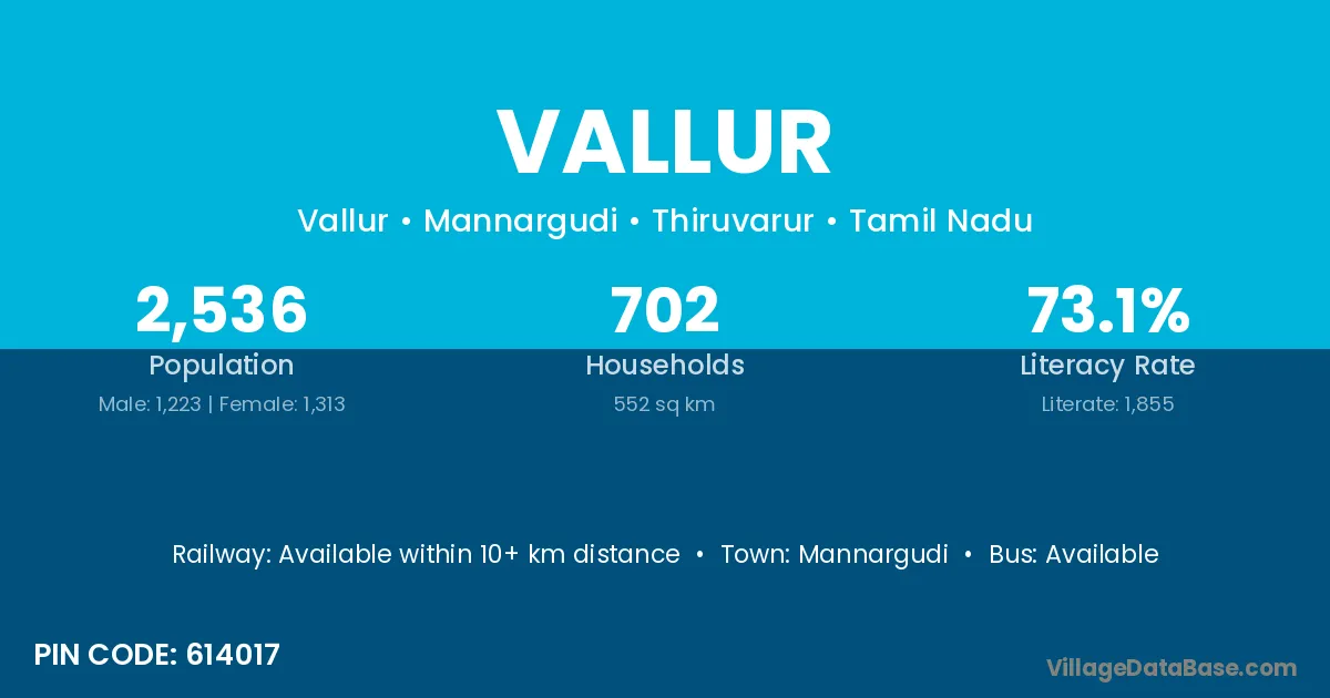 The literacy rate of Vallur village is 59.22%. Male literacy stands at 70.99% and female literacy at 46.89%.