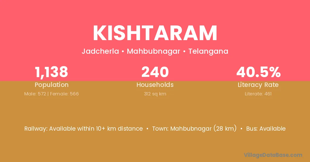 Mahbubnagar (28 km) is the nearest town to Kishtaram village for major economic activities and is located approximately 28 km away.