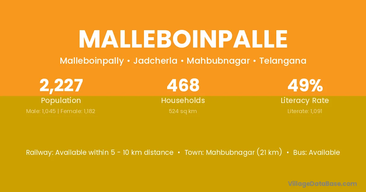 Mahbubnagar (21 km) is the nearest town to Malleboinpalle village for major economic activities and is located approximately 21 km away.