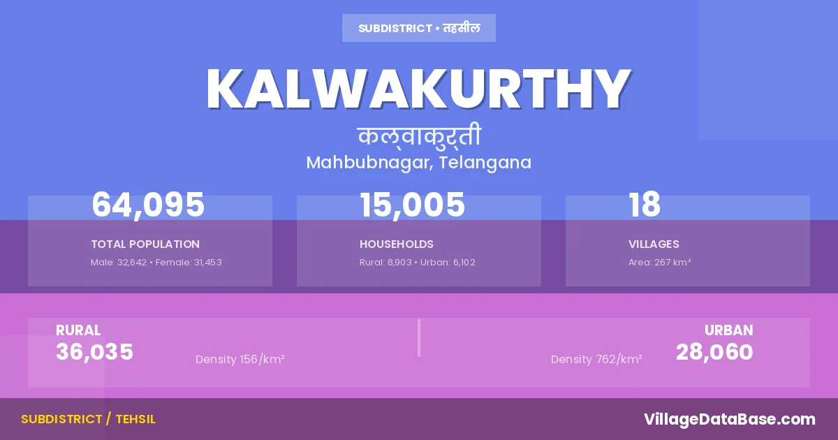 According to the 2011 census The total area of Kalwakurthy Mandal is 267 km², with a population of 64095 people. The population density is 240 inhabitants per square kilometre, and there are approximately 15005 houses in the sub district.