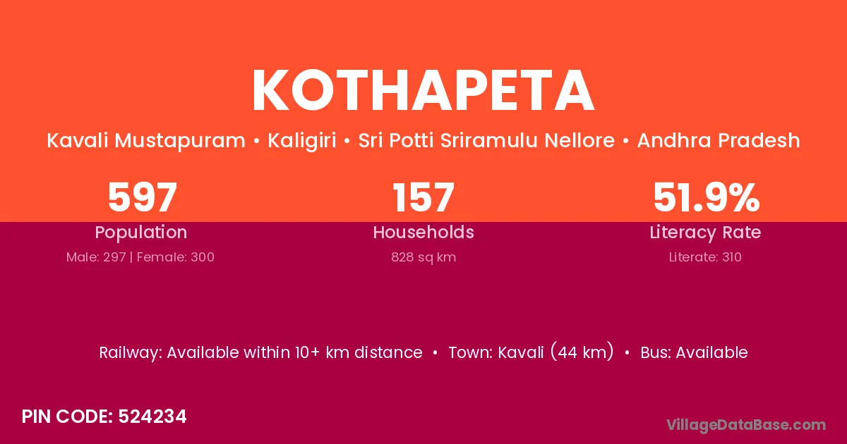 The literacy rate of Kothapeta village is 53.13%. Male literacy stands at 62.88% and female literacy at 42.81%.