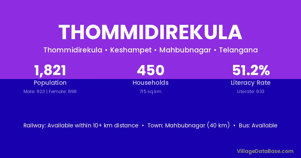 Mahbubnagar (40 km) is the nearest town to Thommidirekula village for major economic activities and is located approximately 40 km away.