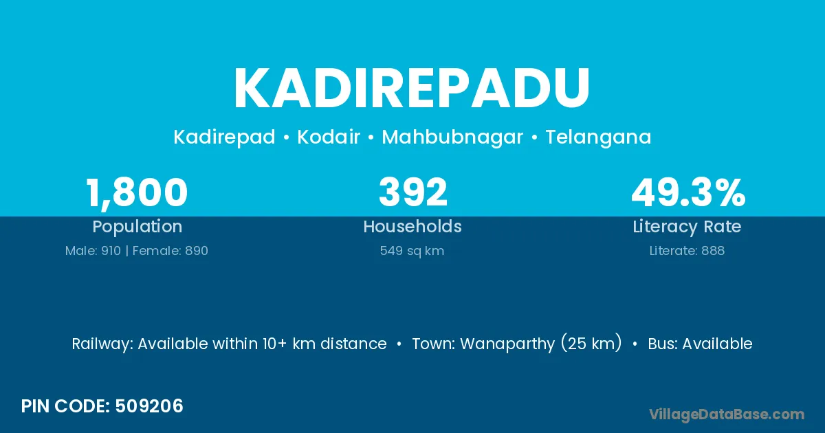 Wanaparthy (25 km) is the nearest town to Kadirepadu village for major economic activities and is located approximately 25 km away.