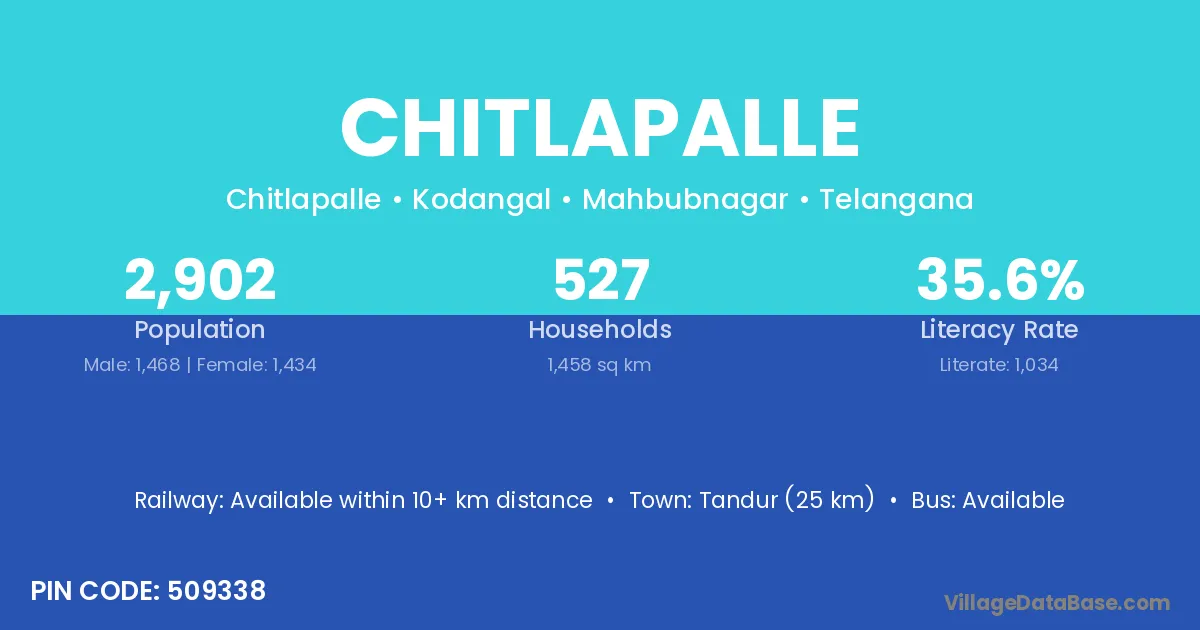 Tandur (25 km) is the nearest town to Chitlapalle village for major economic activities and is located approximately 25 km away.