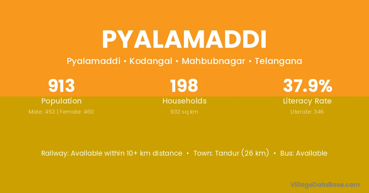 Pyalamaddi village has a total population of 913 people, of which 453 are males and 460 are females.