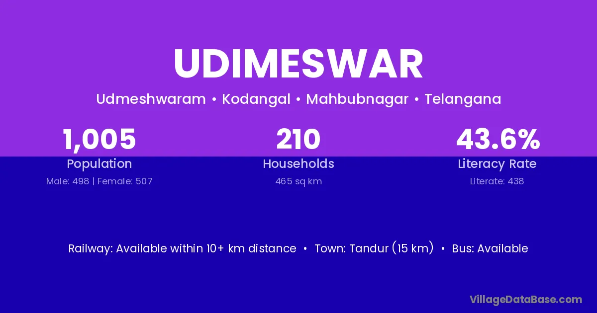 Tandur (15 km) is the nearest town to Udimeswar village for major economic activities and is located approximately 15 km away.