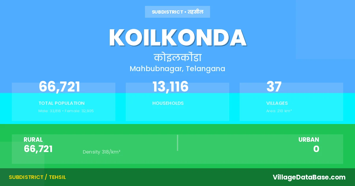 According to the 2011 census The total area of Koilkonda Mandal is 210 km², with a population of 66721 people. The population density is 318 inhabitants per square kilometre, and there are approximately 13116 houses in the sub district.