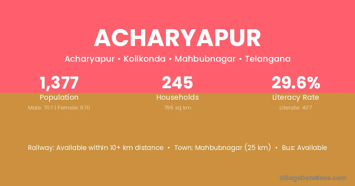 Mahbubnagar (25 km) is the nearest town to Acharyapur village for major economic activities and is located approximately 25 km away.