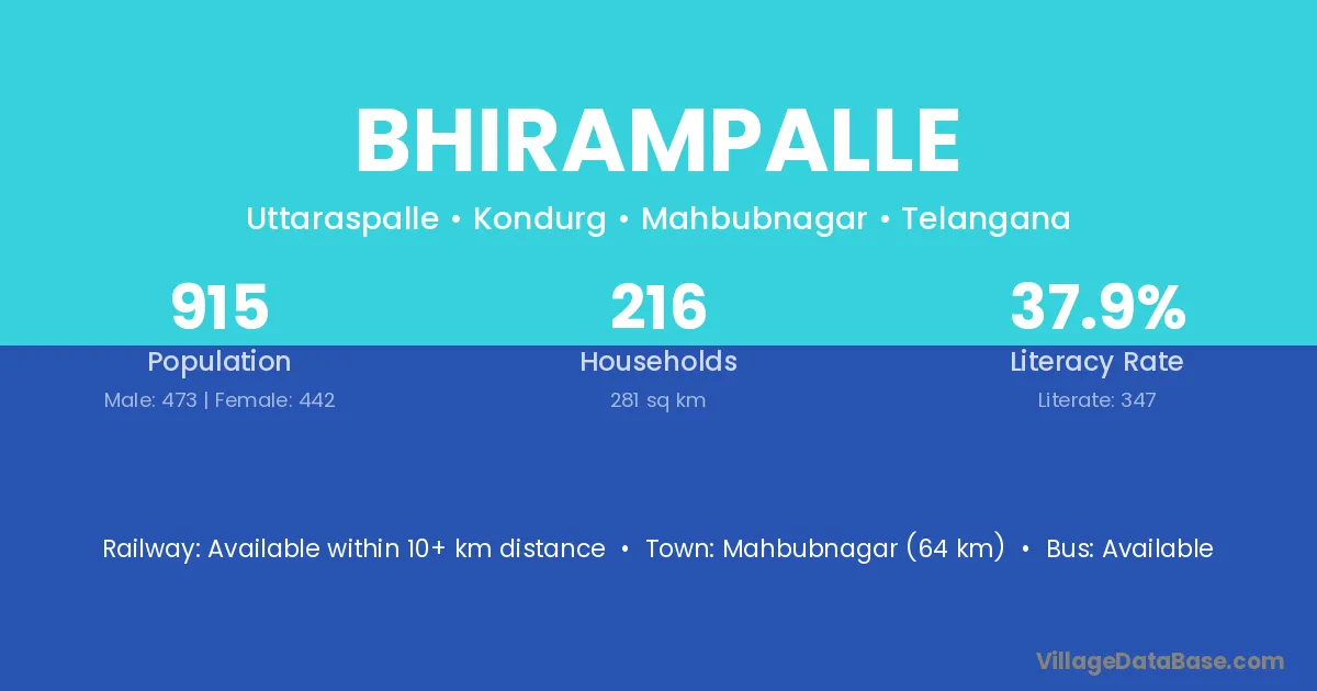 Mahbubnagar (64 km) is the nearest town to Bhirampalle village for major economic activities and is located approximately 64 km away.
