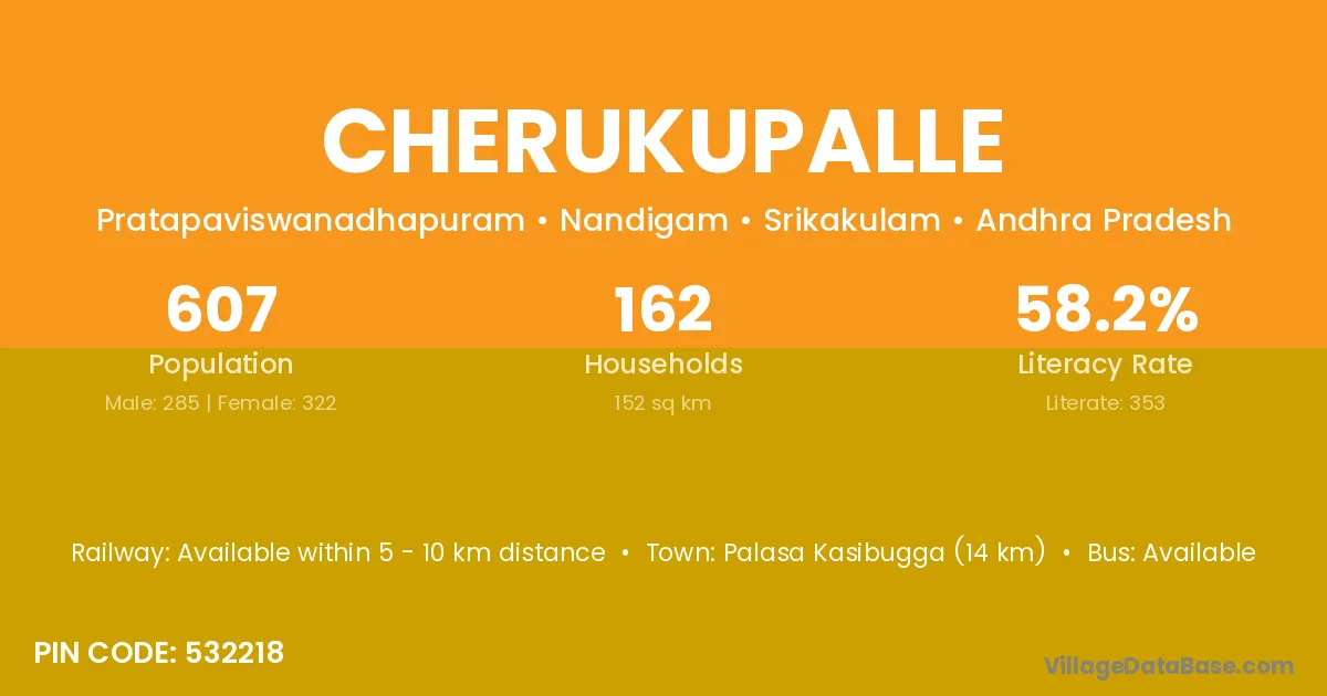 The literacy rate of Cherukupalle village is 44.54%. Male literacy stands at 53.53% and female literacy at 35.41%.