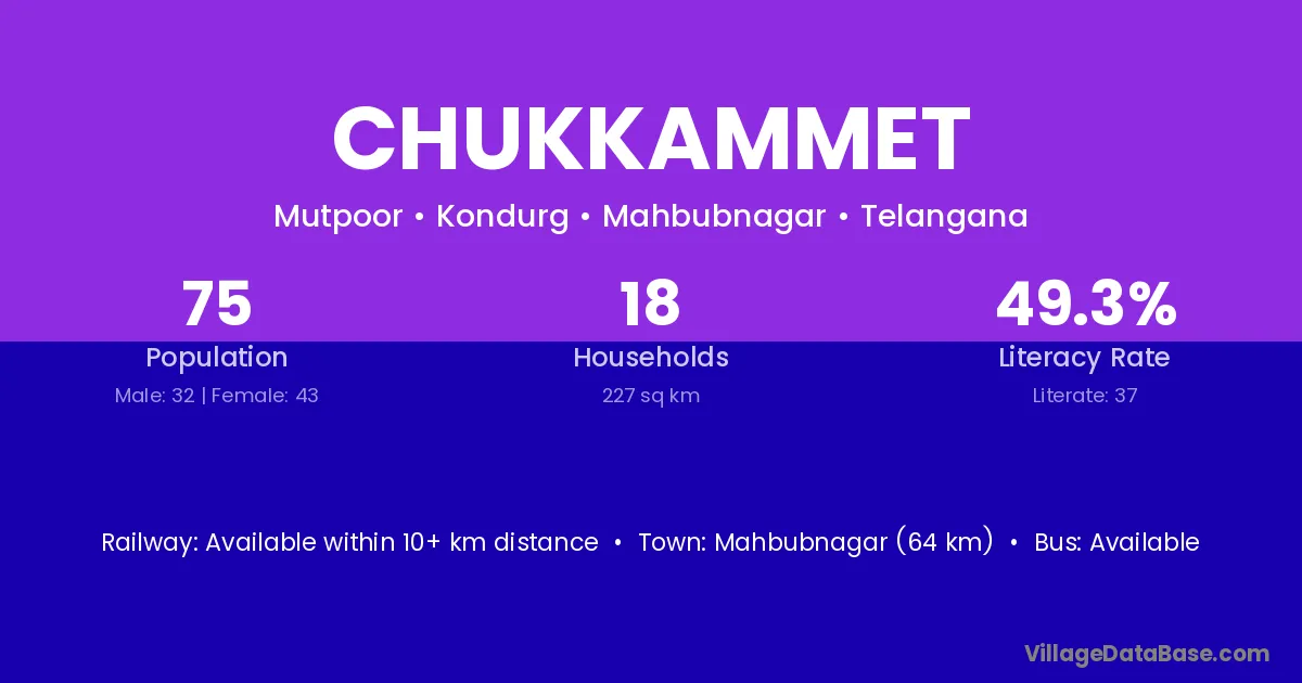 Mahbubnagar (64 km) is the nearest town to Chukkammet village for major economic activities and is located approximately 64 km away.