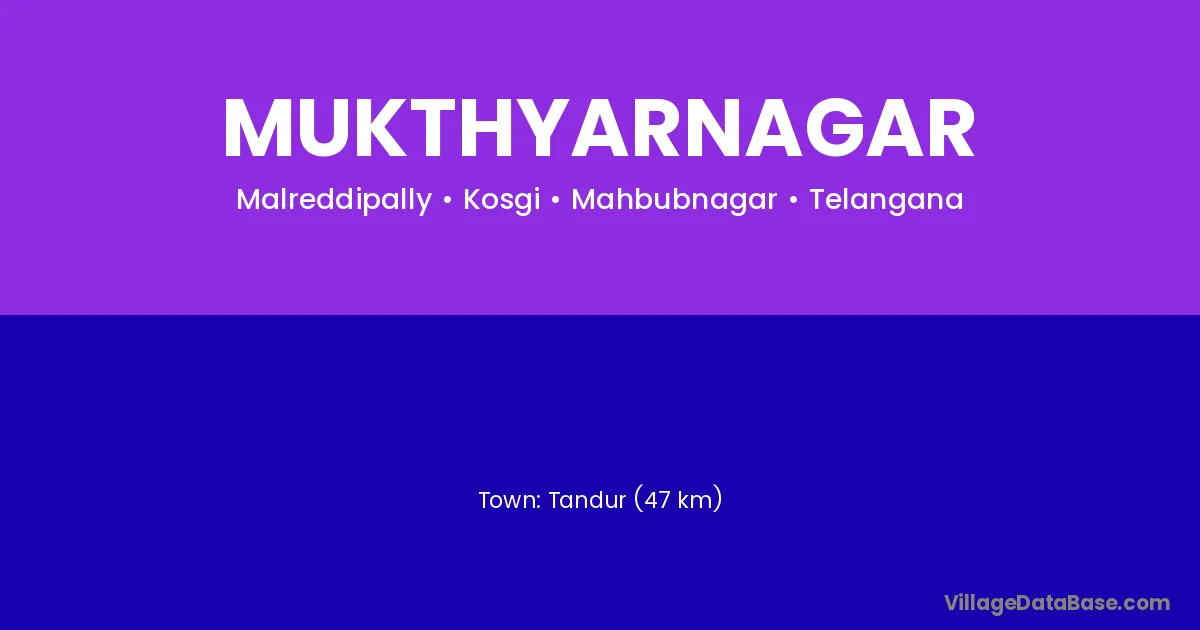 Tandur (47 km) is the nearest town to Mukthyarnagar village for major economic activities and is located approximately 47 km away.