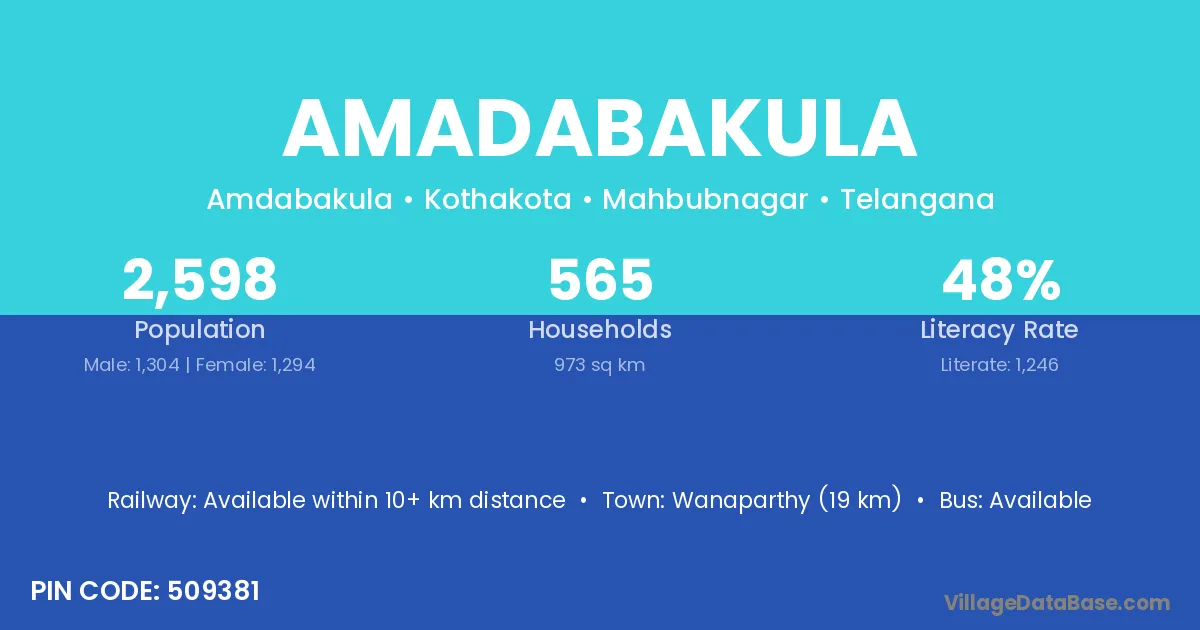 Wanaparthy (19 km) is the nearest town to Amadabakula village for major economic activities and is located approximately 19 km away.