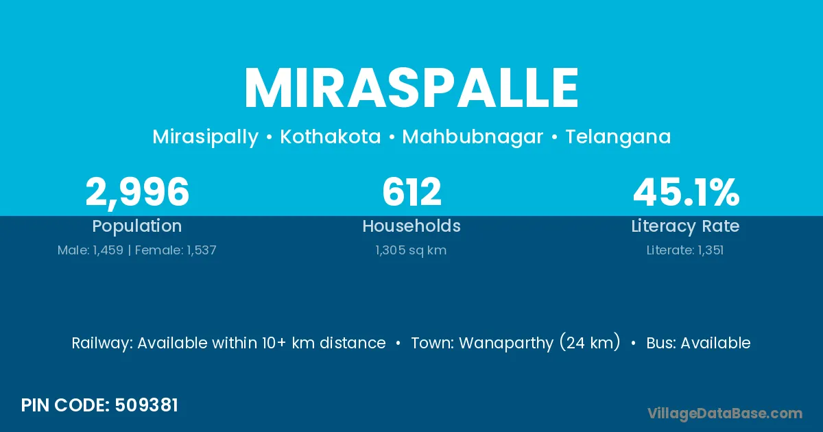 Wanaparthy (24 km) is the nearest town to Miraspalle village for major economic activities and is located approximately 24 km away.