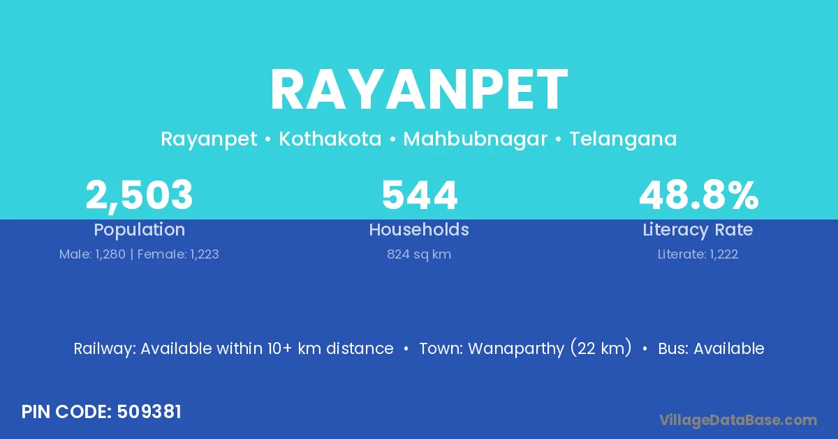 Wanaparthy (22 km) is the nearest town to Rayanpet village for major economic activities and is located approximately 22 km away.