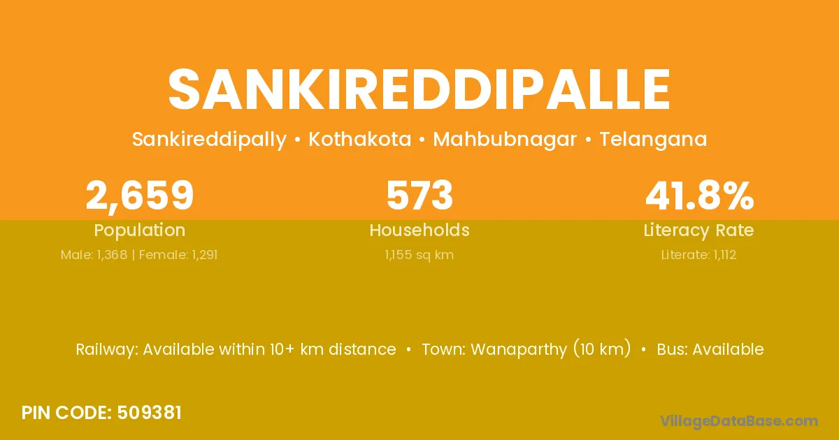 Wanaparthy (10 km) is the nearest town to Sankireddipalle village for major economic activities and is located approximately 10 km away.