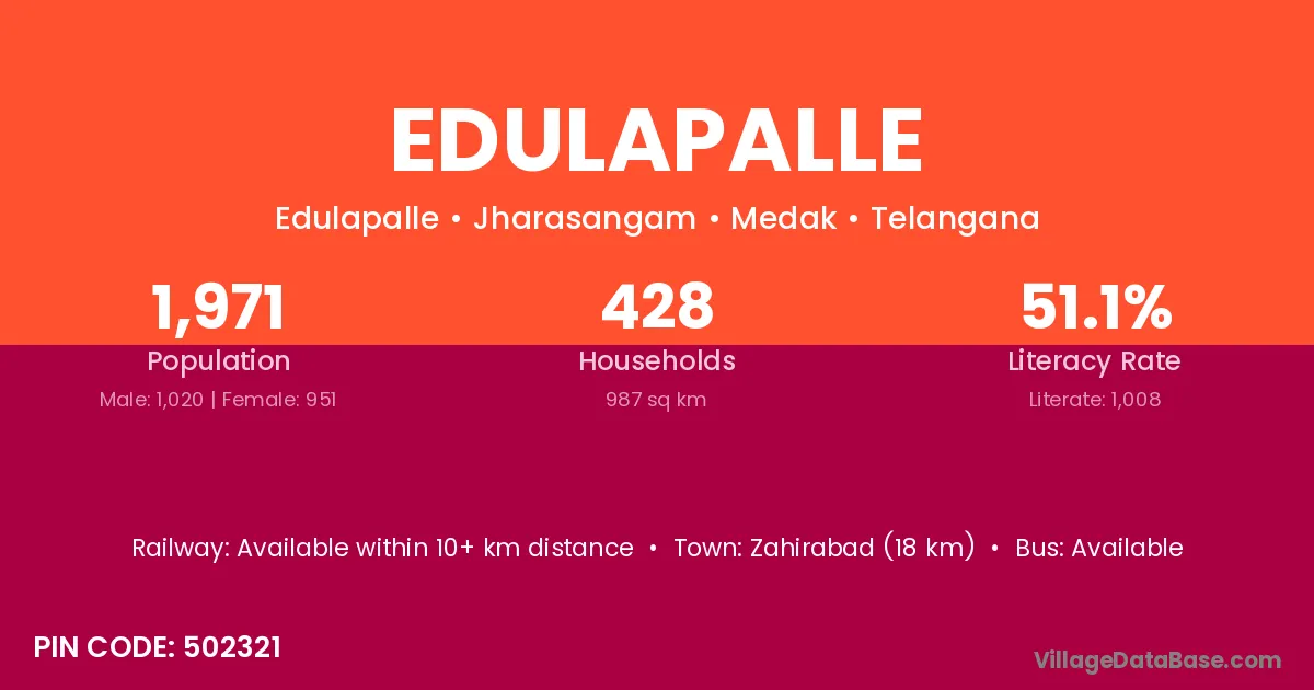 Mahbubnagar (68 km) is the nearest town to Edulapalle village for major economic activities and is located approximately 68 km away.