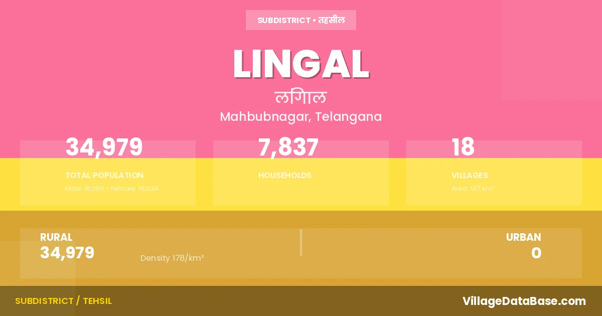 According to the 2011 census The total area of Lingal Mandal is 197 km², with a population of 34979 people. The population density is 178 inhabitants per square kilometre, and there are approximately 7837 houses in the sub district.