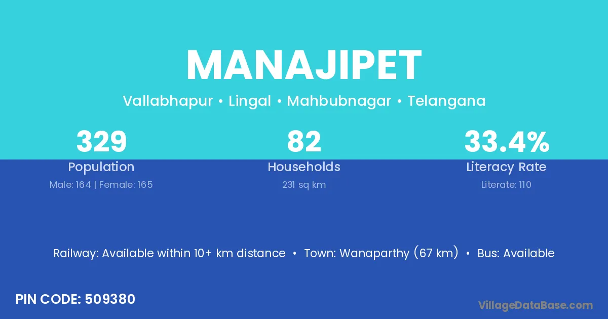 Wanaparthy (67 km) is the nearest town to Manajipet village for major economic activities and is located approximately 67 km away.