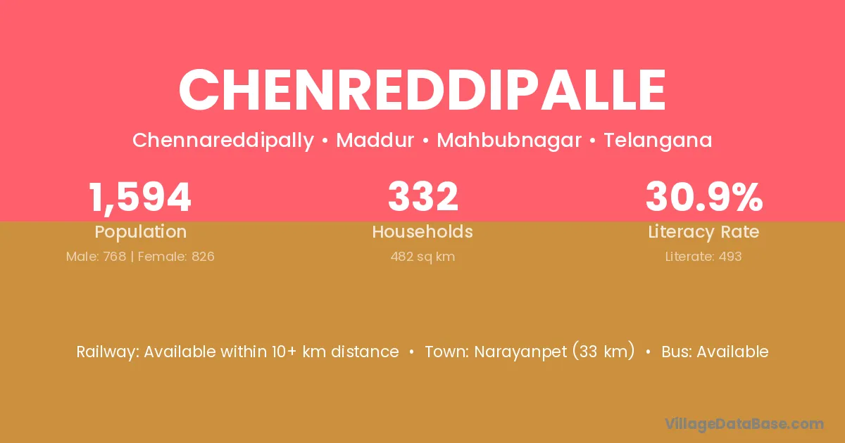 Narayanpet (33 km) is the nearest town to Chenreddipalle village for major economic activities and is located approximately 33 km away.