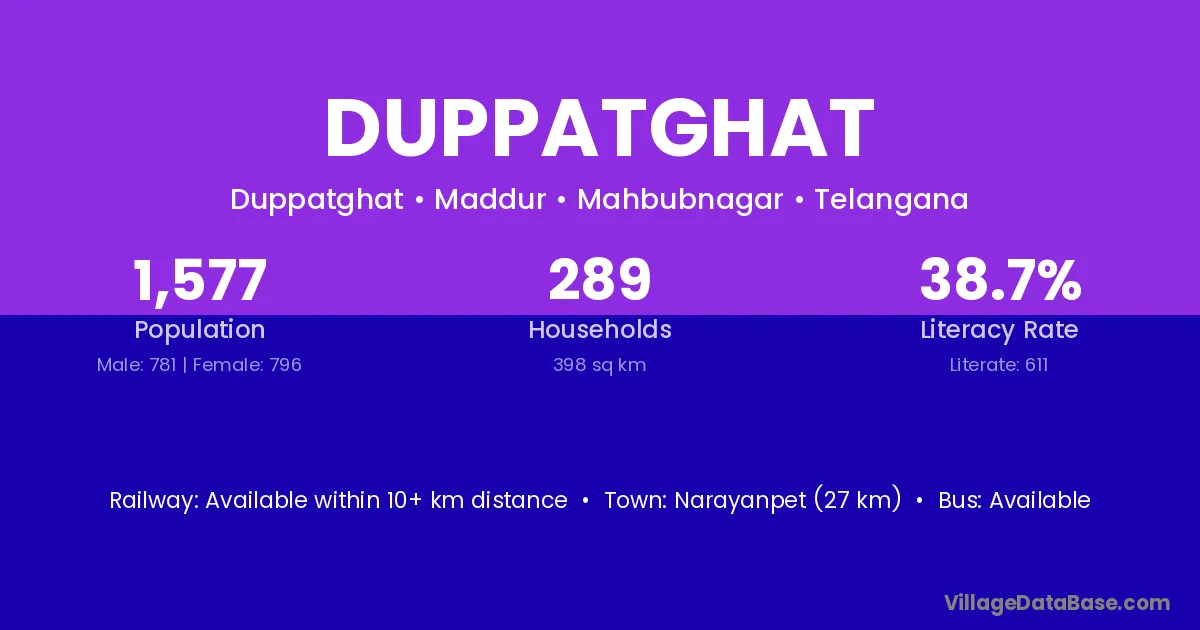 Narayanpet (27 km) is the nearest town to Duppatghat village for major economic activities and is located approximately 27 km away.