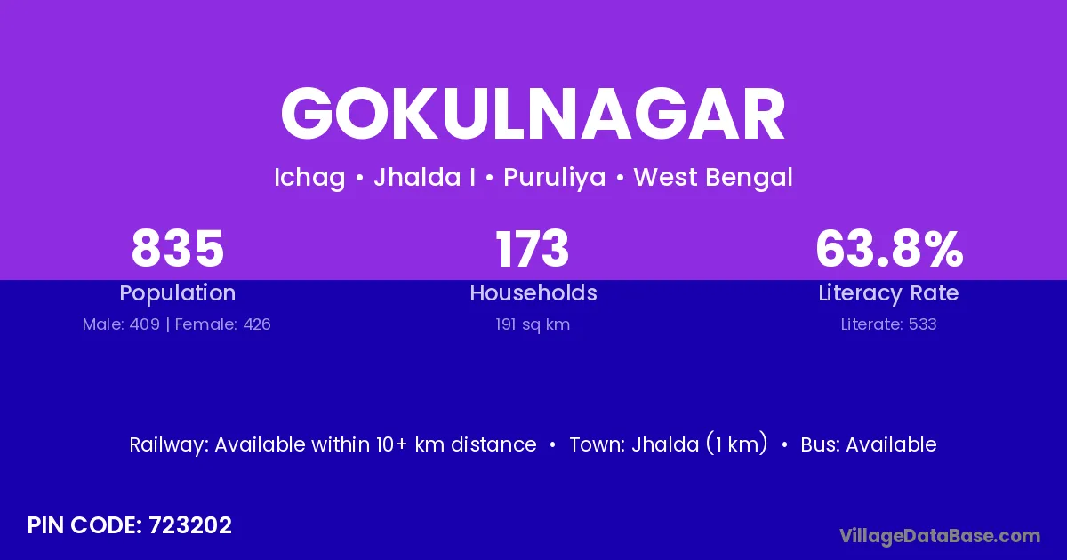Gokulnagar village has a total population of 1,703 people, of which 826 are males and 877 are females.