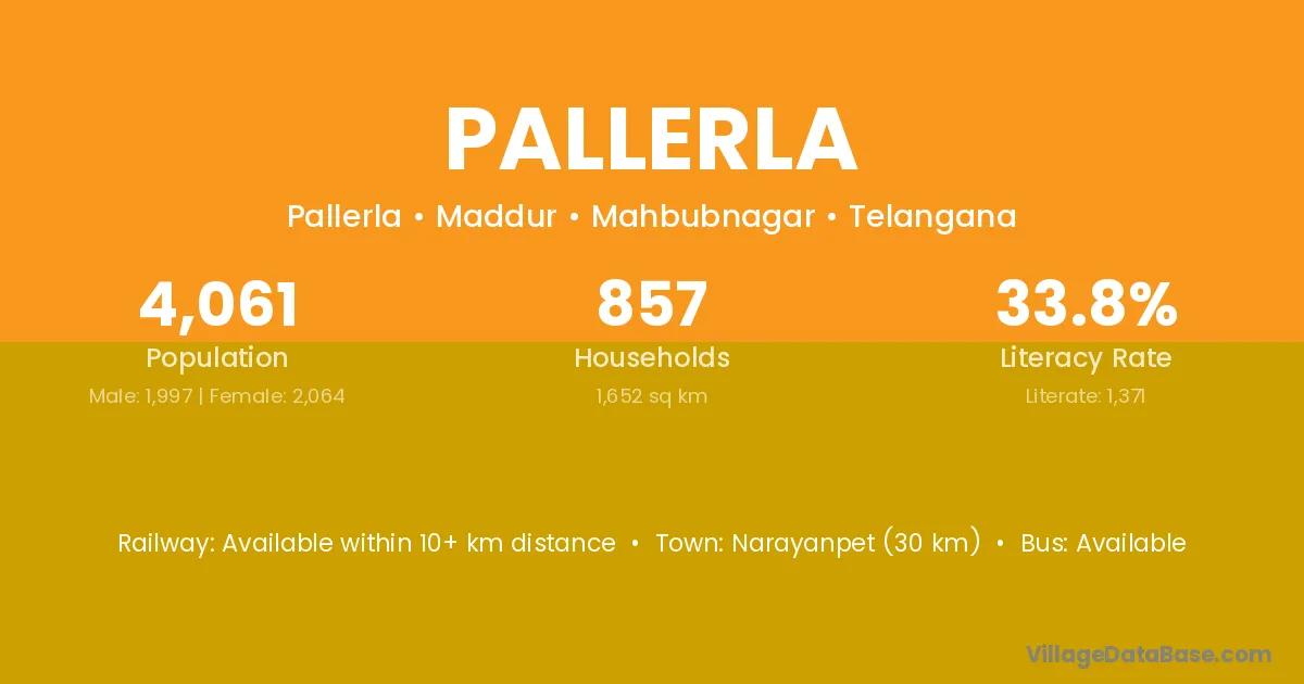 Narayanpet (30 km) is the nearest town to Pallerla village for major economic activities and is located approximately 30 km away.