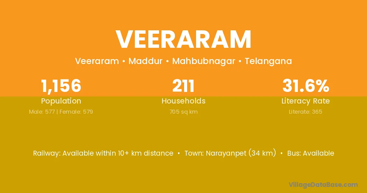Narayanpet (34 km) is the nearest town to Veeraram village for major economic activities and is located approximately 34 km away.