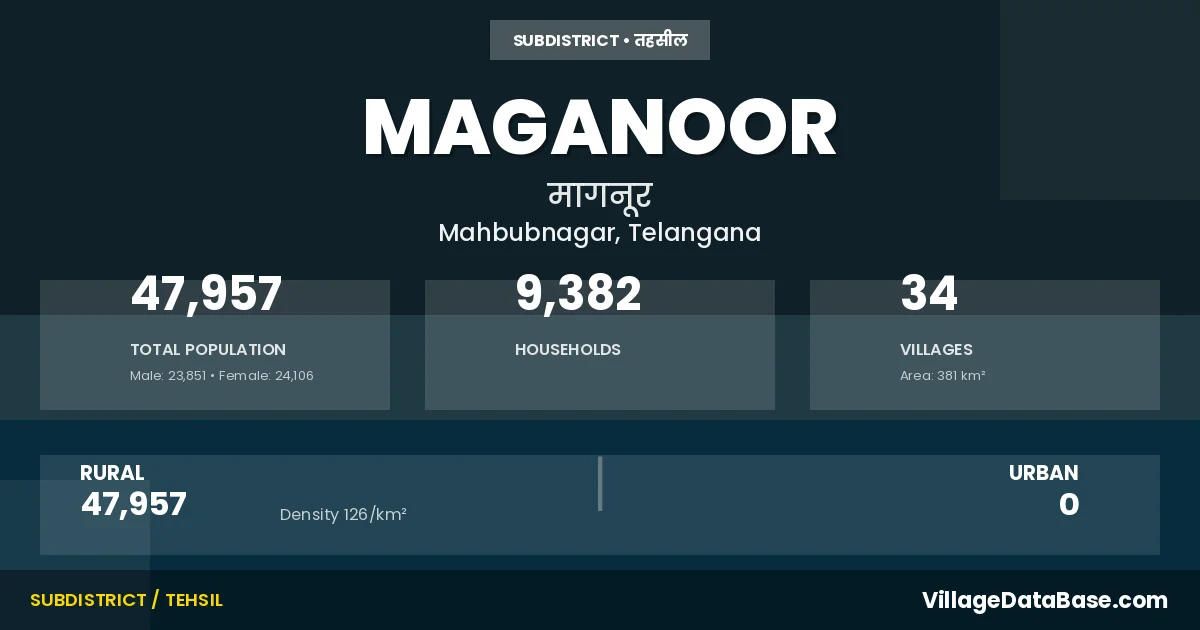 According to the 2011 census The total area of Maganoor Mandal is 381 km², with a population of 47957 people. The population density is 126 inhabitants per square kilometre, and there are approximately 9382 houses in the sub district.