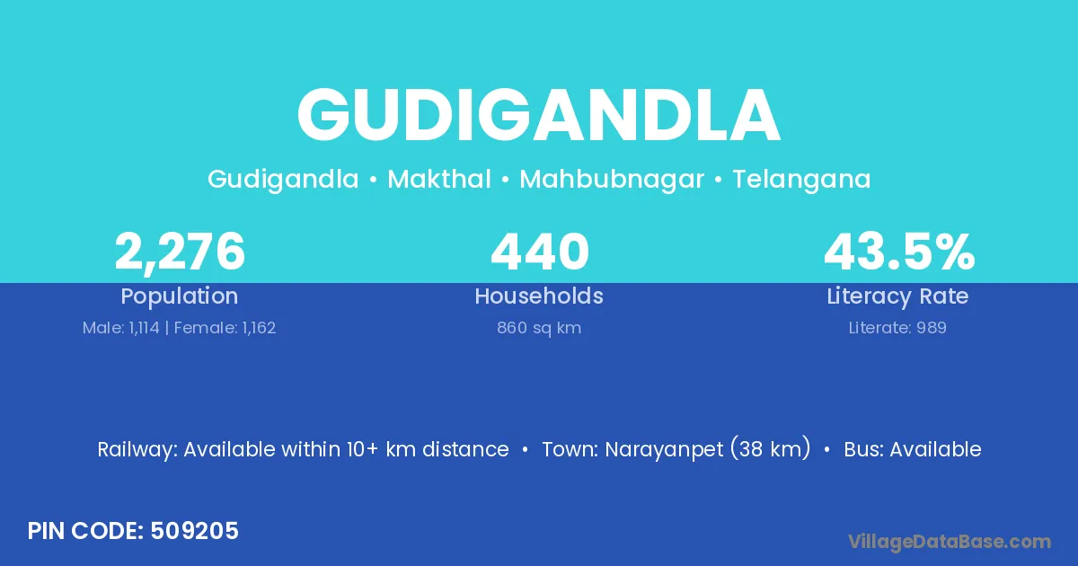 Narayanpet (38 km) is the nearest town to Gudigandla village for major economic activities and is located approximately 38 km away.